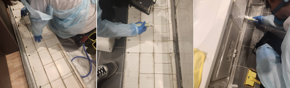 多くのユニットバスには、浴槽の側面に「取り外し可能なカバー(エプロン)」があります。この内部は、湿気がこもりやすく、石鹸カスや皮脂がたまり栄養源が豊富なため、カビの温床になりやすい場所です。日常清掃では通常ここまで開けません。この部分もしっかり除去作業を行いカビ菌をリセットしていきます。