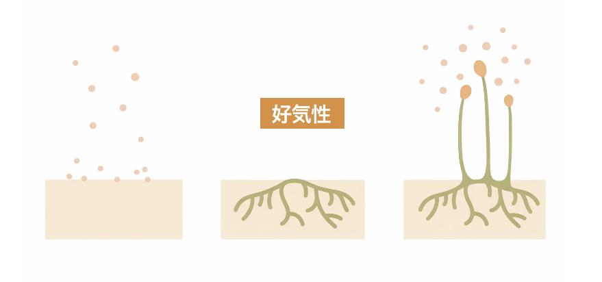 これらの条件が同時に整うことで、カビは発芽し、急速に増殖します。
