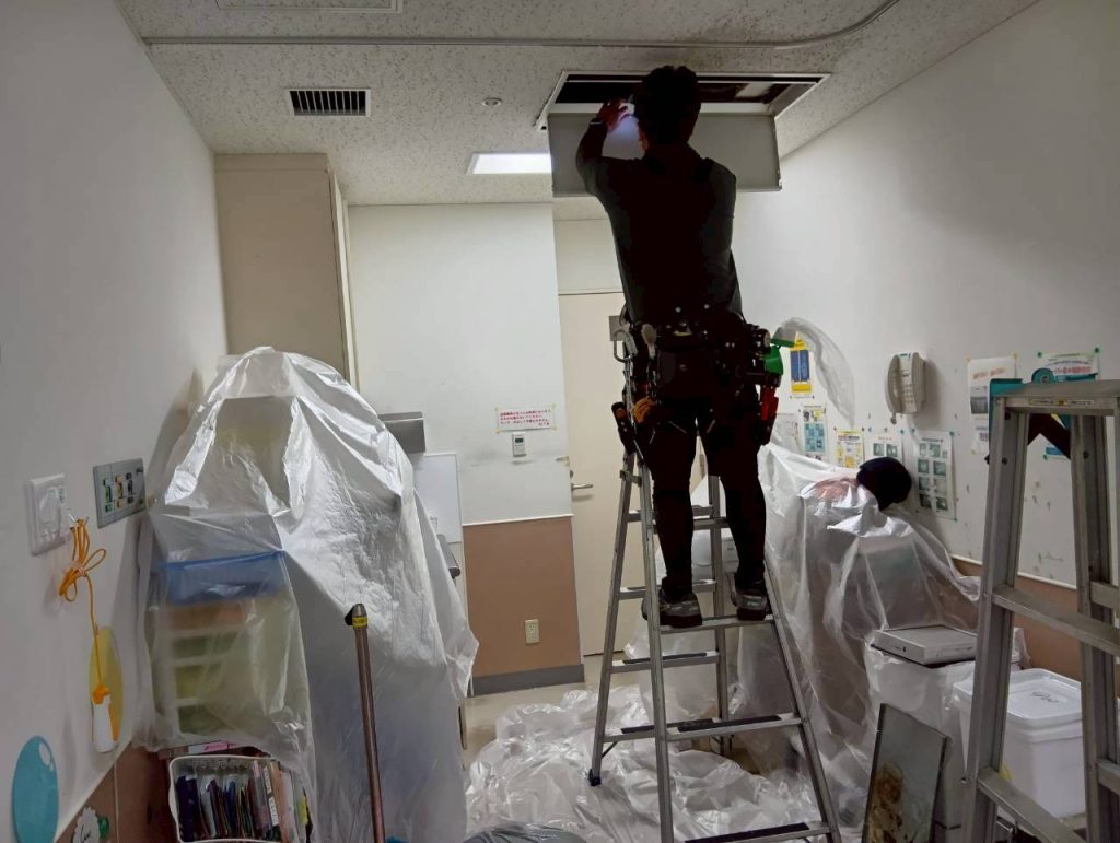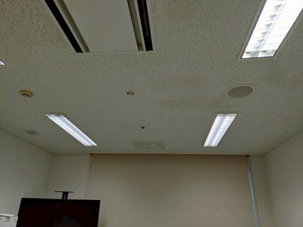 作業箇所天井ファンコイルエアコン内部 天井 軽天材 壁面クロス 天井埋め込み式エアコン 窓、窓サッシまわり ロスナイ 換気扇 天井裏ボード 壁面クロス上部 空間除菌 エアコンまわり ロスナイ 空調設備まわり ジプトーン 空調設備 天井