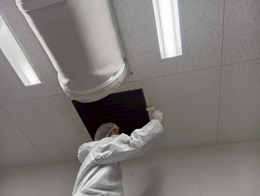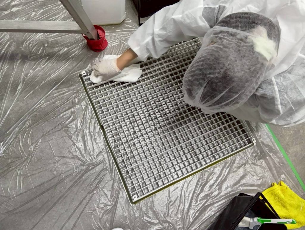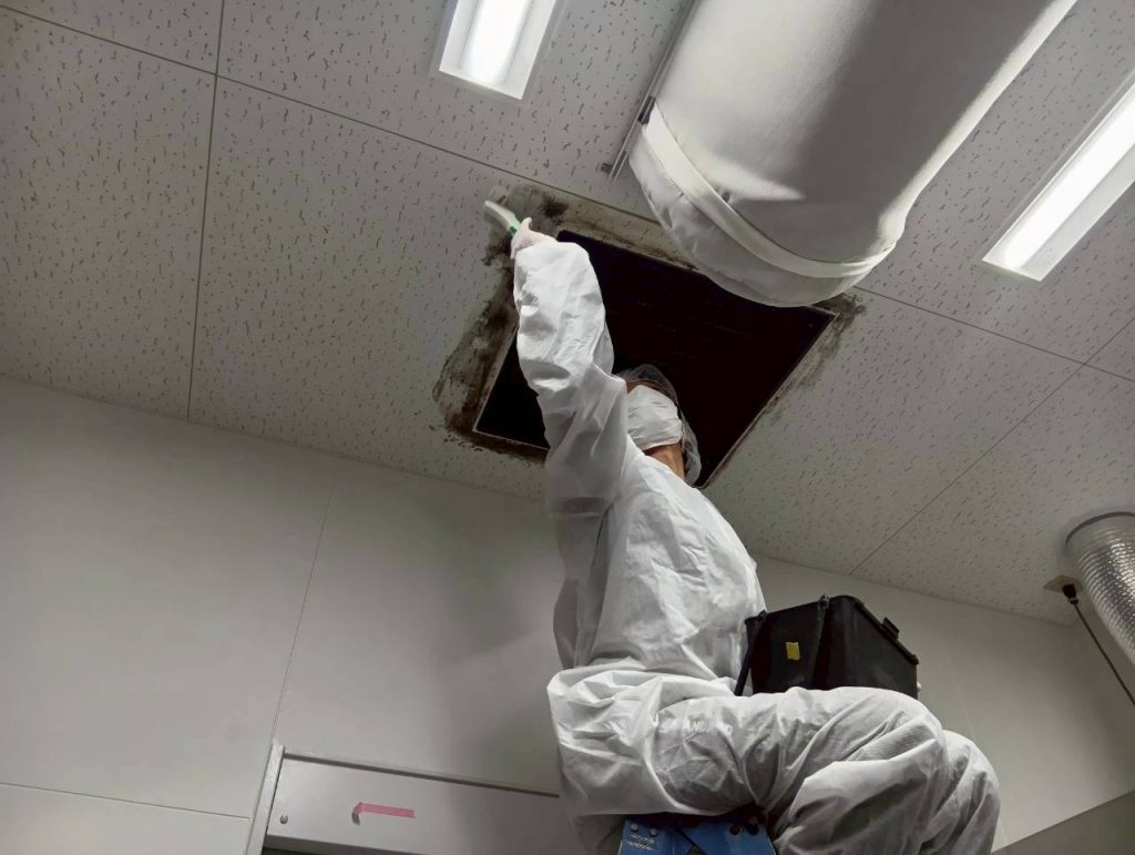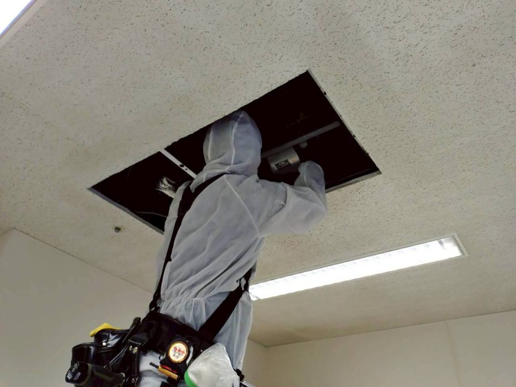 岐阜県岐阜市内に有ります医療施設様からのご依頼で、天井空調設備(ファンコイルエアコン)、天井ジプトーン、換気扇、ガラリ、アネモ、床面、クロス壁面のカビ除去及び除菌(アルコール)処理施工に伺ってきました。